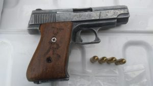 Se detuvieron a tres hombres, ya que se les localiza un arma de fuego calibre 9 milímetros tipo escuadra con 4 cartuchos útiles, así como cinco envoltorios de cristal.