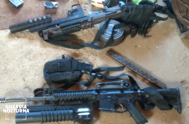 De igual manera se encontraron 50 kilogramos de marihuana así como solventes y un fuerte armamento conformado por tres granadas calibre 40, una granada de mano, dos armas largas (ambas con lanza granadas), tres armas cortas, cargadores de disco y varios cartuchos, todo esto junto con fornituras y ropa táctica.