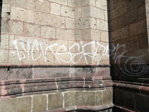 Luego de revisar la zona encontraron tres grafitis, uno que abarcaba un área aproximada de uno por tres metros, en la fachada principal del templo y dos de uno por dos metros en las bancas de la explanada.