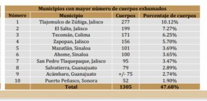 Alejandro Encinas, subsecretario de Derechos Humanos Población y Migración de la Secretaría de Gobernación, notificó que Jalisco, Sinaloa, Colima, Guanajuato y Sonora concentran el 65.9 por ciento de los cuerpos localizados en fosas clandestinas.