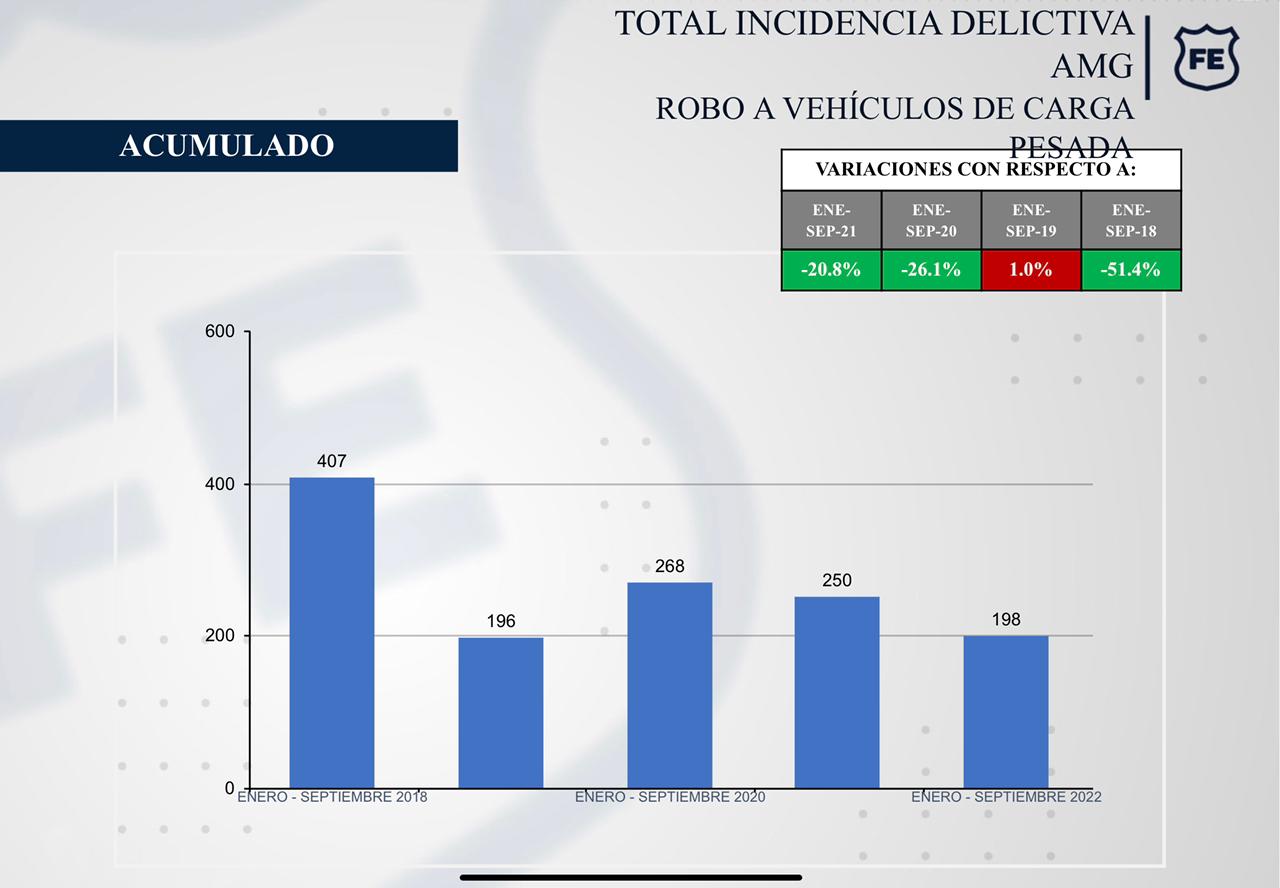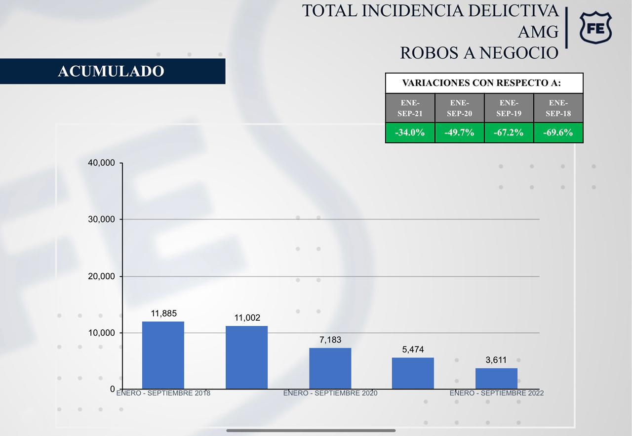 De acuerdo a cifras del Sistema Nacional de Seguridad Pública, la incidencia de robos de alto impacto en el Zona Metropolitana de Guadalajara, disminuyó un 54.7 por ciento de enero a septiembre de 2022, comparado con el mismo periodo del año 2018; en este mismo lapso se registran descensos en víctimas de homicidio por agresión directa y feminicidio.