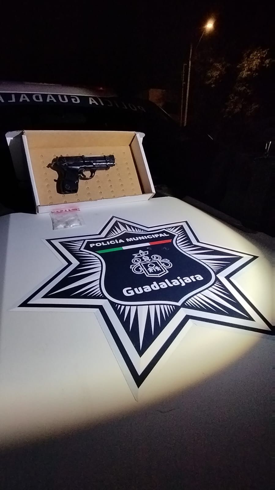 Al conductor se le realizó una inspección de rutina y le fueron localizadas un arma de fuego de utilería y ocho envoltorios con lo que podría ser la droga conocida como cristal.