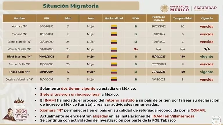 El subsecretario de Seguridad también indicó que solamente dos de las ocho mujeres tienen vigente su estancia en México, pero sólo siete tienen un ingreso legal al país. Una de ellas, identificada como Xiomara, de 31 años de edad y con fecha de ingreso el 28 de mayo de 2022, se explicó que permanecerá en el país, toda vez que cuenta con estatus de refugiada por la Comisión Mexicana de Ayuda a Refugiados (Comar).