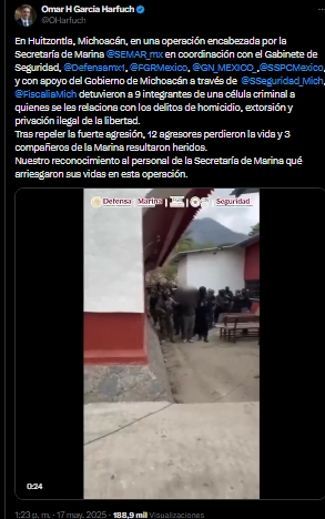 En un operativo llevado a cabo este fin de semana en Michoacán, activos de diferentes corporaciones ejecutaron a 12 presuntos miembros de una célula delictiva por cargos de homicidio, extorsión y privación ilegal de la liberad, así como reclutamiento forzado, informó el titular de Seguridad y Protección Ciudadana, Omar García Harfuch, tras repeler un ataque del grupo armado en la localidad de Huitzontla.