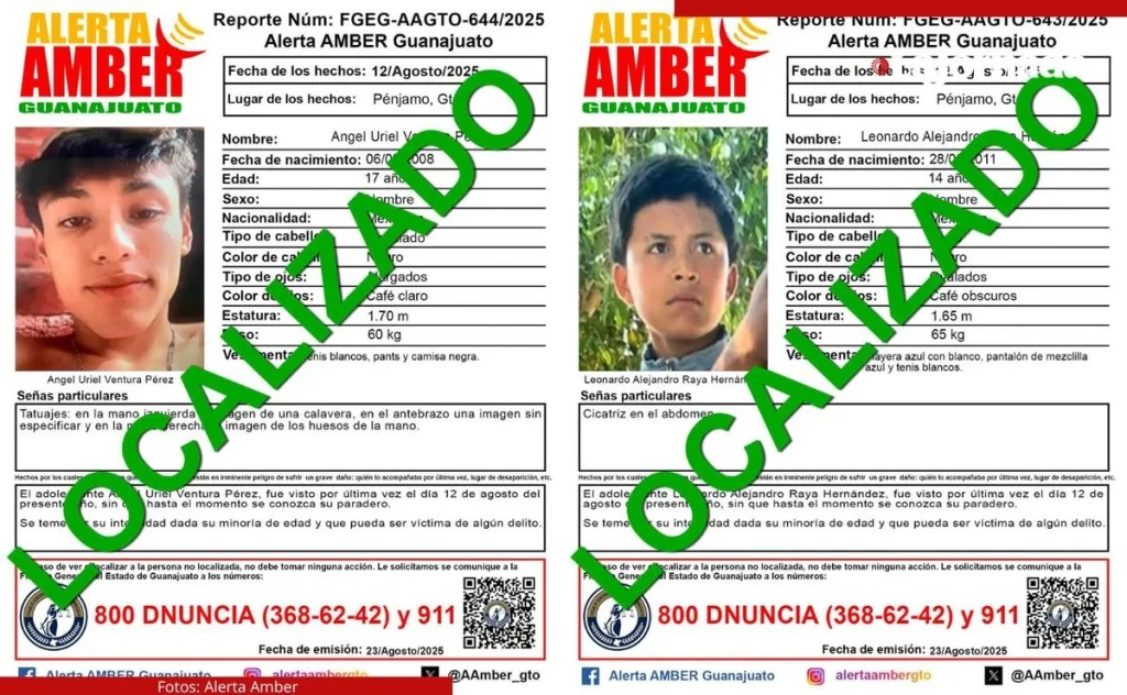 Los menores fueron identificados como Ángel Uriel V. P., de 17 años, y Leonardo Alejandro R. H., de 14 años, quienes habían sido reportados con Alerta Amber desde el 12 de agosto.