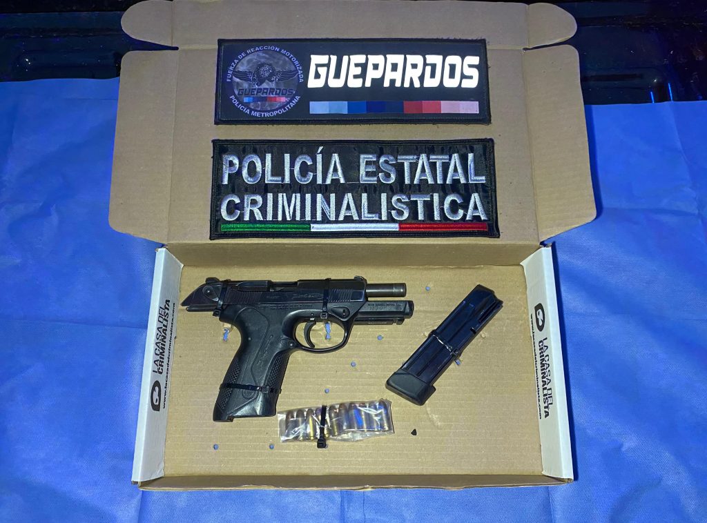 El individuo circulaba en una cuatrimoto verde, vestía prendas tipo tácticas con supuestos logotipos de una institución del Estado de México y llevaba consigo lo que parecía ser un arma de fuego. Al realizarle una inspección, le aseguraron una pistola calibre 9 milímetros y un cargador con 10 cartuchos útiles.