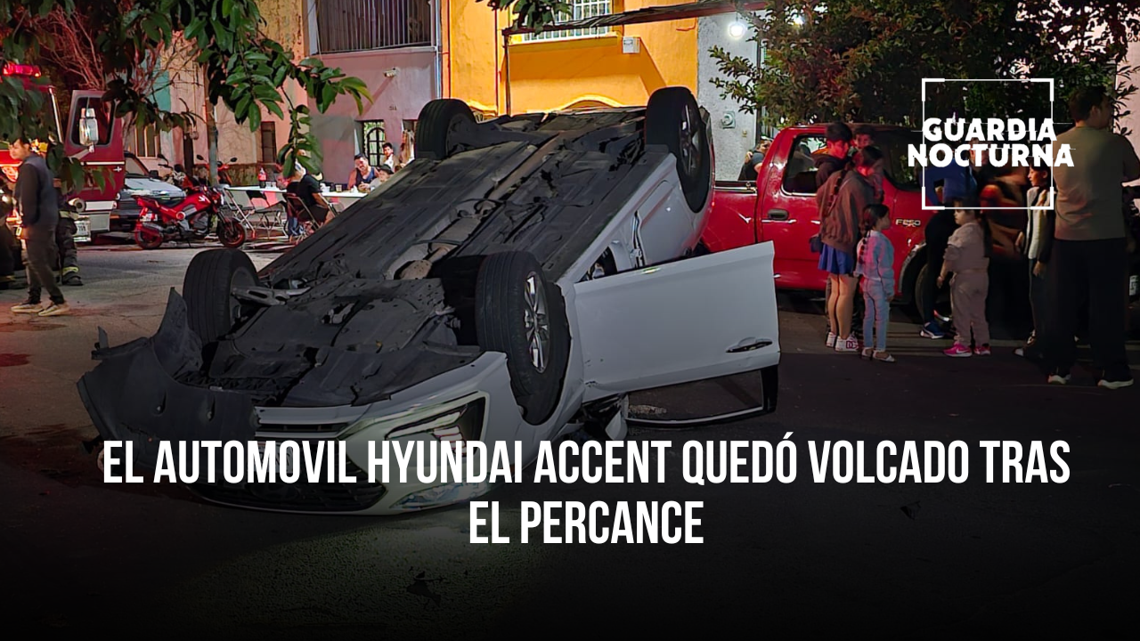 El impacto fue tan fuerte que provocó que el Hyundai Accent diera un giro y terminara volcado, con las llantas hacia arriba. A pesar de lo aparatoso del siniestro, los dos ocupantes del vehículo, un conductor y su copiloto, ambos de 19 años de edad, salieron del auto milagrosamente ilesos, sin requerir traslado a ningún puesto de socorro.