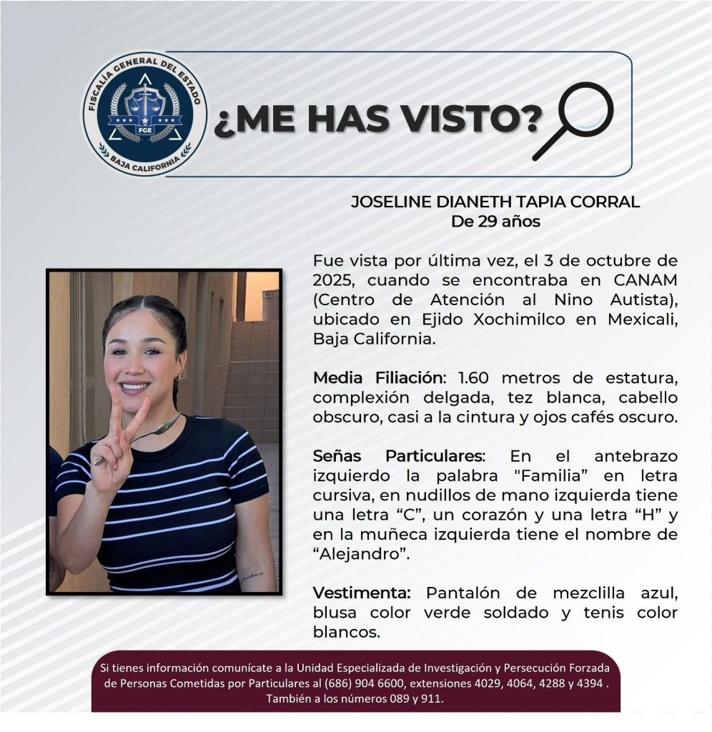 La violencia sacudió nuevamente a Mexicali, Baja California, tras el hallazgo del cuerpo de Joseline Dianeth Tapia Corral, una joven de 29 años reportada como desaparecida desde el pasado viernes 3 de octubre. Su cuerpo fue localizado maniatado, con cinta en la boca y visibles signos de violencia dentro de un canal ubicado en el fraccionamiento Residencial.