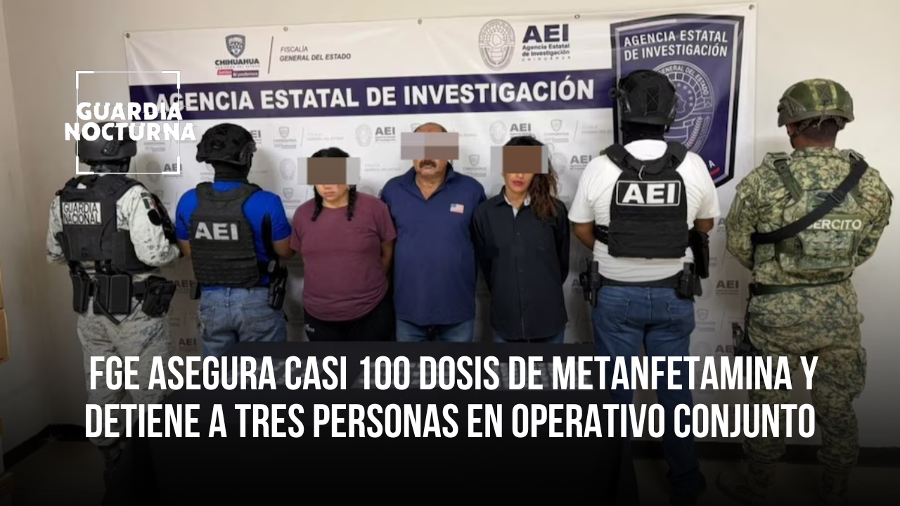 Durante un operativo conjunto realizado en el fraccionamiento Portal del Roble, en Ciudad Juárez, autoridades detuvieron a tres personas y aseguraron 97 envoltorios con una sustancia granulada con características similares a la metanfetamina.
