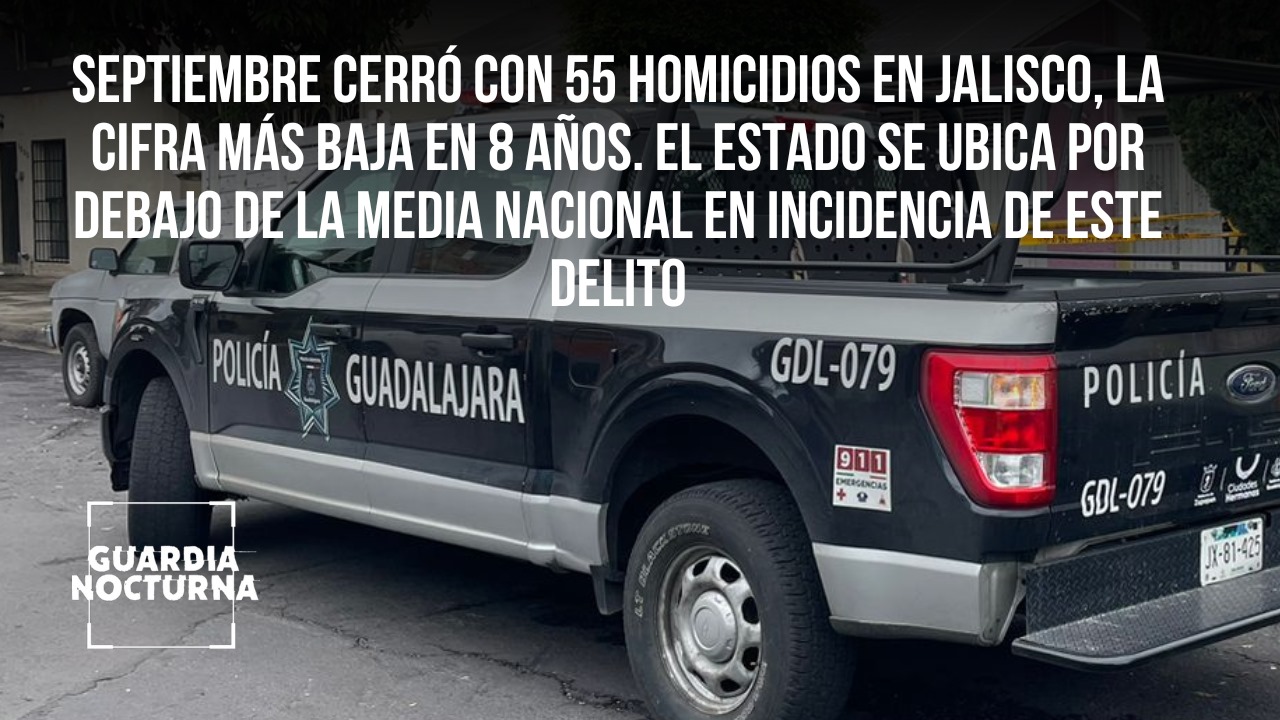 Septiembre de 2025 se convirtió en el mes con la menor incidencia de homicidios dolosos en Jalisco de los últimos ocho años, según cifras de la Fiscalía Estatal. El balance fue de 55 víctimas en todo el mes, un promedio diario de 1.8 casos, y una tasa de 10.8 por cada 100 mil habitantes, cifra que coloca al estado en el lugar 14 a nivel nacional, por debajo de la media que es de 13.6.