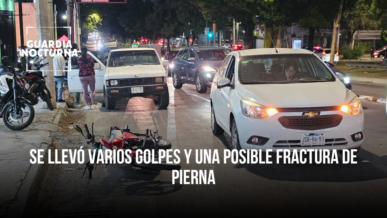 El incidente fue provocado por una conductora que cambió de carril sin la debida precaución, cerrándole el paso al joven. La maniobra imprudente de la automovilista obligó al conductor de la moto a salirse de la vialidad, proyectándose e impactando fuertemente contra la banqueta. El motociclista sufrió varios golpes y se reportó una posible fractura de pierna como consecuencia del impacto, quedando lesionado en el lugar del accidente.