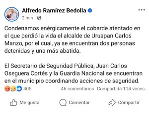 Tras el ataque, Carlos Manzo fue trasladado a un nosocomio para su atención médica y su estado de salud se reportó como grave. Momentos después el Gabinete de Seguridad confirmó su muerte a través de redes sociales.