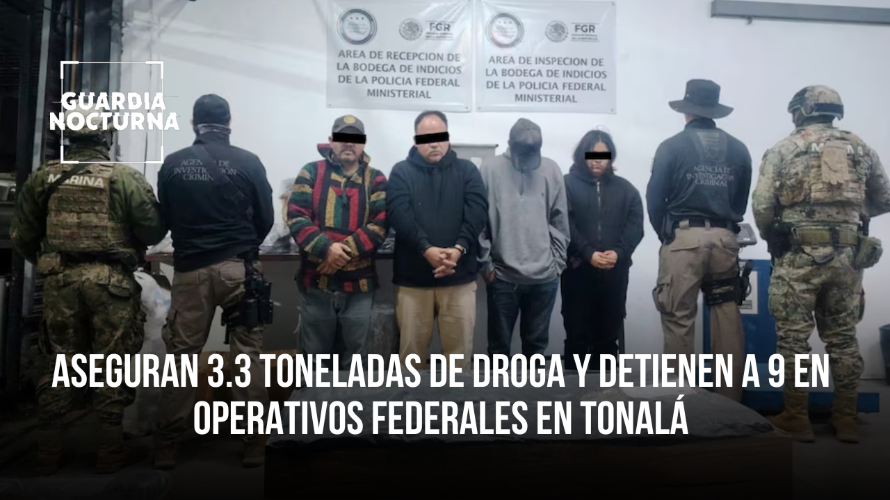 El Gabinete de Seguridad del Gobierno de México informó la detención de nueve presuntos integrantes de una célula delictiva dedicada a modificar maquinaria industrial para ocultar estupefacientes en el municipio de Tonalá, Jalisco. Entre los detenidos se encuentra un menor de edad.