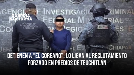 Héctor “N”, identificado como “El Coreano”, fue detenido en Chiapas por autoridades de seguridad, tras ser señalado por su presunta responsabilidad en los delitos de delincuencia organizada, desaparición cometida por particulares y trata de personas. De acuerdo con las investigaciones, el detenido operaba bajo las órdenes de José Gregorio Lastra Armida, alias “El Lastra”.