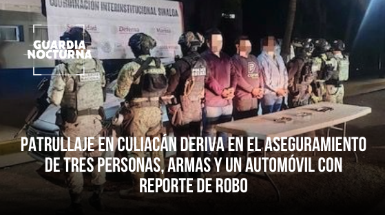 Autoridades de seguridad detuvieron a tres personas y aseguraron armas cortas y un vehículo con reporte de robo durante un operativo realizado en Culiacán, Sinaloa. El despliegue se efectuó la tarde de este miércoles como parte de las labores de vigilancia en distintos puntos de la capital.