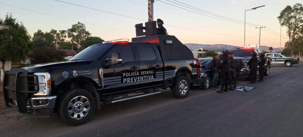 Durante un operativo en la carretera San Luis Potosí–Lagos de Moreno, en el cruce con la carretera a Guadalajara, los oficiales detectaron un vehículo ocupado por cinco hombres que mostraron una actitud evasiva al notar la presencia policial. Tras marcarles el alto y realizar una inspección, se les aseguraron tres armas de fuego cortas, un rifle de aire comprimido, un inhibidor de señal y un chaleco con placas balísticas.