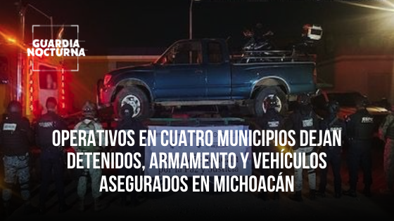 Como parte de la implementación del Plan Michoacán por la Paz y la Justicia, autoridades federales informaron la detención de diez personas y el aseguramiento de armamento, drogas y vehículos durante operativos realizados en los municipios de Uruapan, Apatzingán, Tarímbaro y Huetamo. Las acciones fueron encabezadas por personal de la Secretaría de la Defensa Nacional, Guardia Nacional, Secretaría de Marina, SSPC, FGR, SSP estatal y FGE.