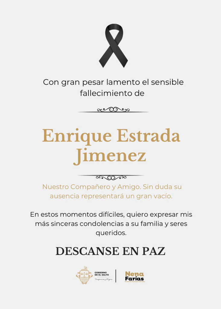 El Gobierno de El Salto informó el fallecimiento de Enrique Estrada Jiménez, director del DIF municipal, quien fue localizado sin vida durante la noche y madrugada de este viernes. A través de un comunicado, la administración municipal expresó su profundo pesar por la muerte de su compañero y envió condolencias a su familia.