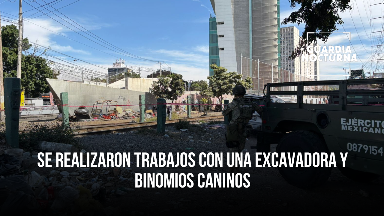 Las labores incluyeron el uso de maquinaria pesada, como una excavadora, así como binomios caninos, los cuales realizaron inspecciones en puntos específicos cercanos a las vías ferroviarias, como parte de las diligencias en curso.