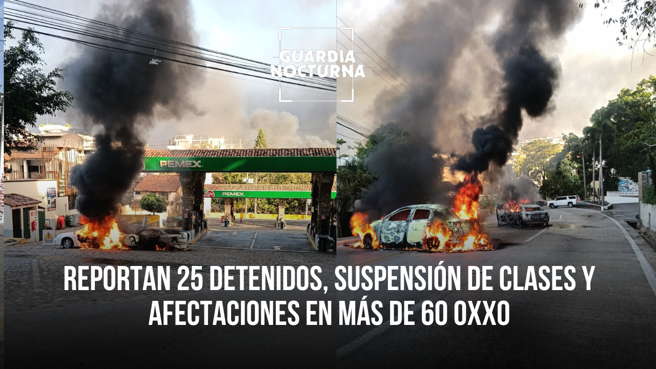 De manera preliminar se reporta la detención de 25 personas: 11 por su presunta participación en hechos violentos y 14 más por supuestos actos de saqueo o rapiña. Entre los detenidos, dos fueron capturados en Lázaro Cárdenas y Fuelle; cuatro más en Carretera a Chapala, a la altura de Puerta del Sol; y cinco en el Parque Morelos, estos últimos por parte de la Guardia Nacional. También se aseguraron varios vehículos en distintos puntos de la Zona Metropolitana.