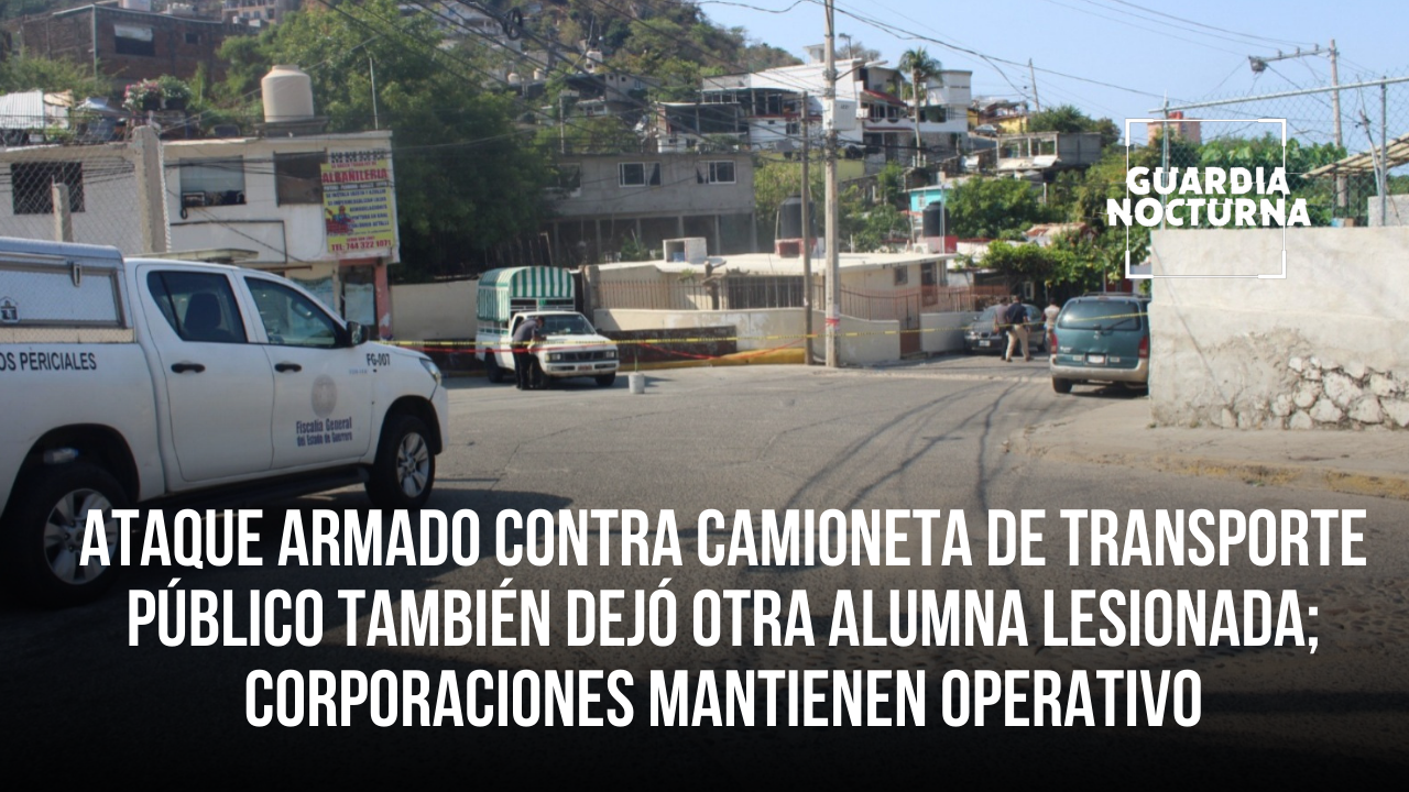 Una agresión armada contra una camioneta de transporte público en la colonia Chinameca, muy cerca del plantel 2 del Colegio de Bachilleres en Acapulco, Guerrero, dejó al menos dos personas sin vida y otra lesionada la mañana de este 19 de febrero.