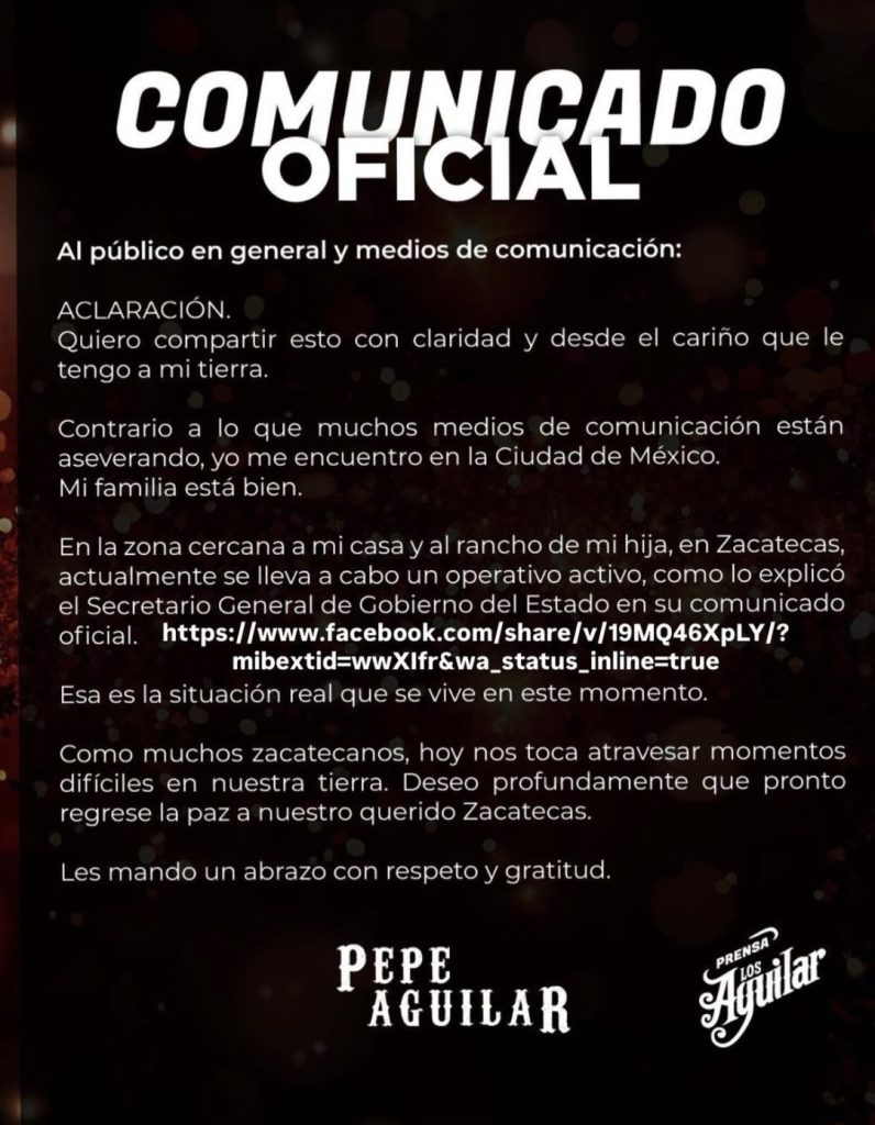 Pepe Aguilar también expresó su preocupación por el clima de violencia que atraviesa su estado natal y compartió un mensaje solidario:  “Como muchos zacatecanos, hoy nos toca atravesar momentos difíciles en nuestra tierra. Deseo profundamente que pronto regrese la paz a nuestro querido Zacatecas.”