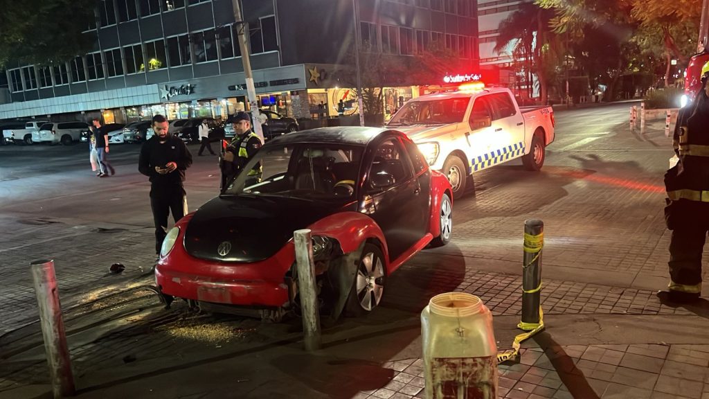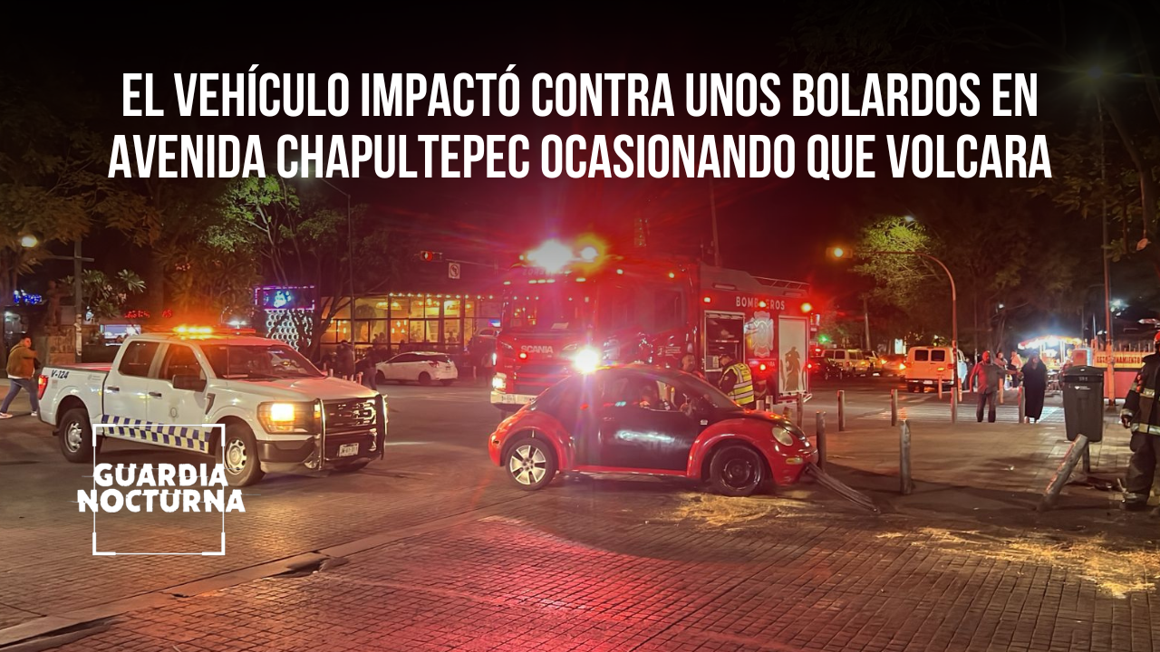 Un aparatoso accidente se registró en el cruce de la avenida Chapultepec y la calle Lerdo de Tejada, en la colonia Americana de Guadalajara. El conductor de un vehículo particular terminó volcado tras chocar contra unos bolardos.