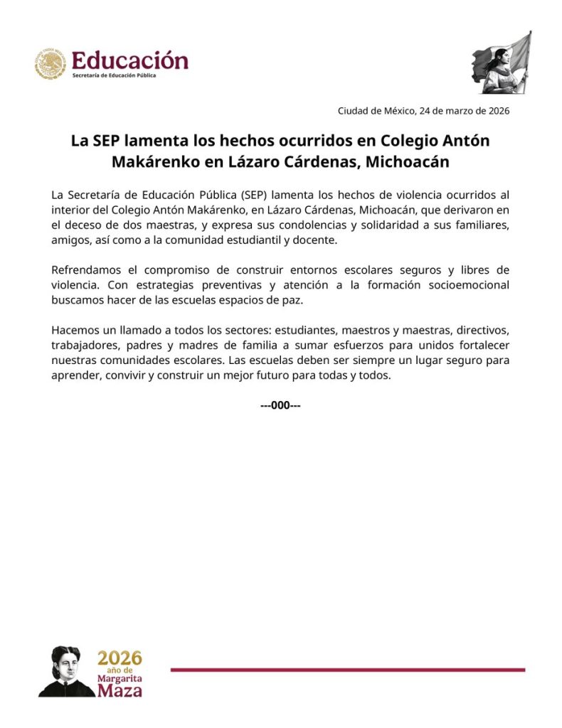 La Secretaría de Educación Pública (SEP) lamentó el asesinato de dos maestras ocurrido en una preparatoria privada en el municipio de Lázaro Cárdenas, Michoacán, luego de que un estudiante de 15 años ingresara armado al plantel y disparara contra las docentes.