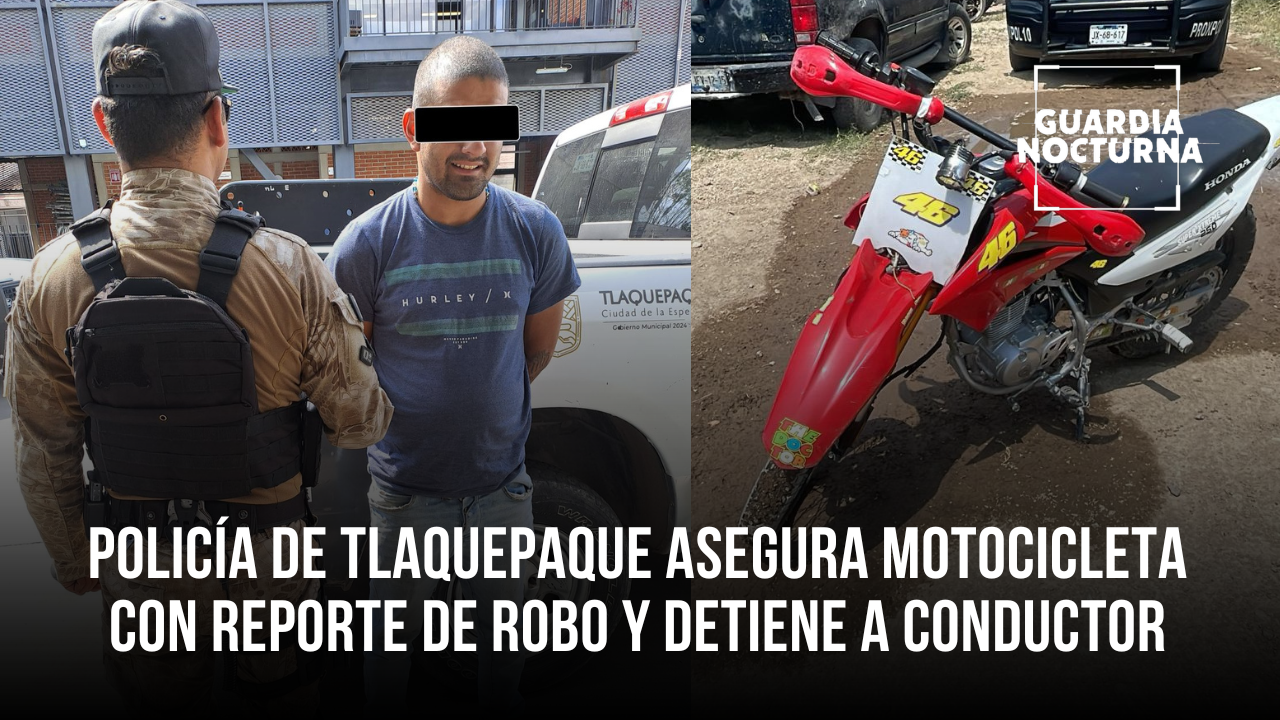 Elementos de la Secretaría de Seguridad y Protección Ciudadana de San Pedro Tlaquepaque detuvieron a un hombre que circulaba a bordo de una motocicleta con reporte de robo en la colonia Francisco Silva Romero.
