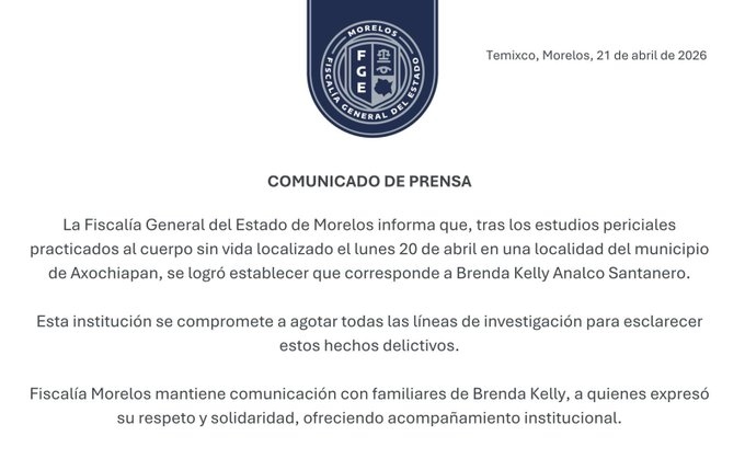 Brenda Kelly Analco Santanero, reportada como desaparecida desde el 16 de abril tras acudir a una supuesta oferta de trabajo difundida en redes sociales, fue localizada sin vida en el municipio de Axochiapan, Morelos. Su familia acusa que la búsqueda estuvo marcada por retrasos y omisiones por parte de la Fiscalía estatal.