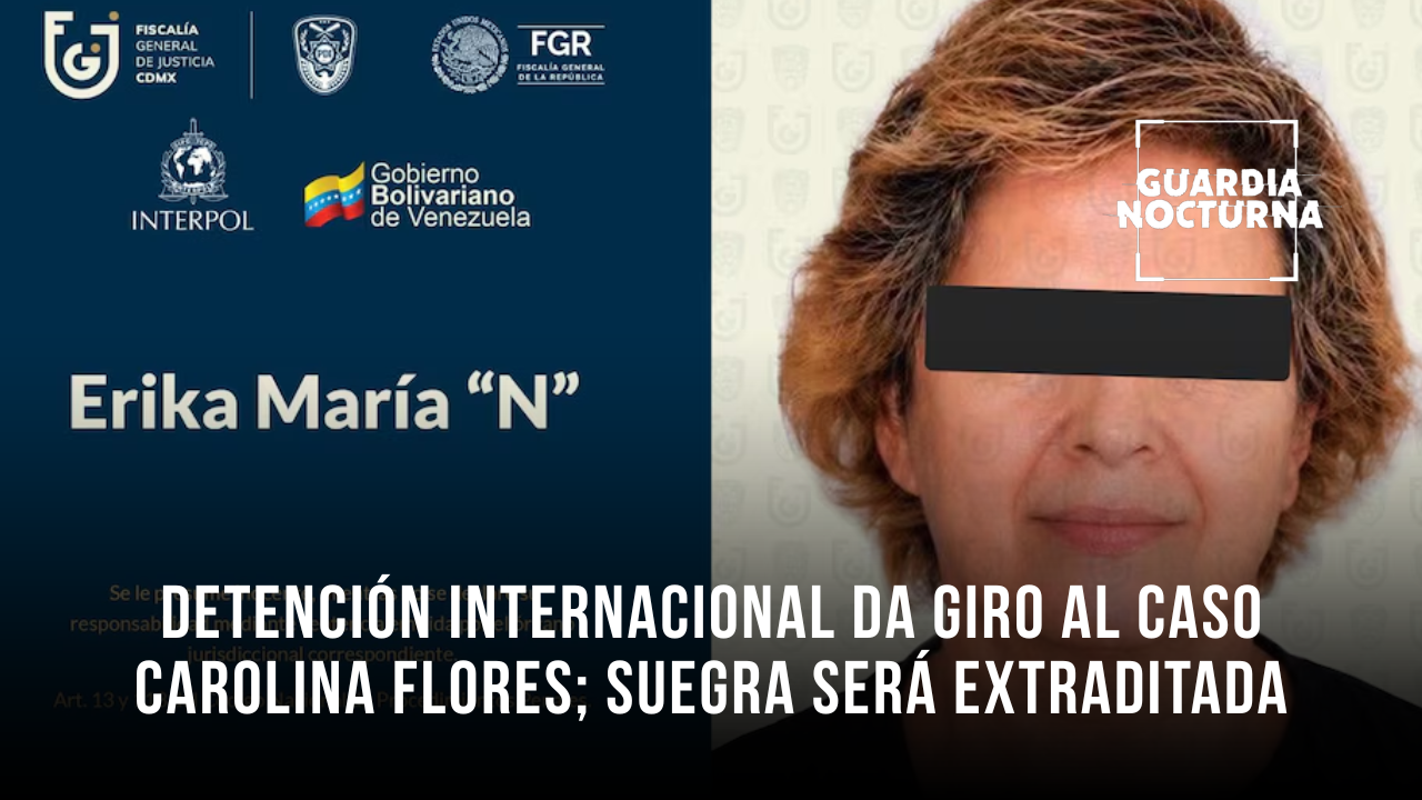 Erika “N”, suegra de la exreina de belleza Carolina Flores, fue detenida la noche del 29 de abril en Venezuela, tras la emisión de una ficha roja de Interpol por su presunta responsabilidad en el delito de feminicidio. Actualmente permanece bajo custodia mientras autoridades mexicanas realizan los trámites para su extradición.